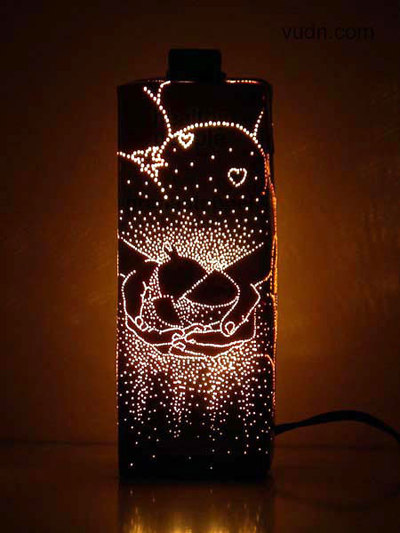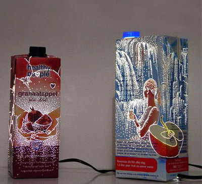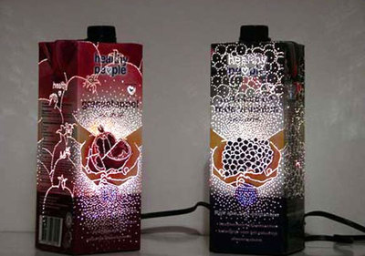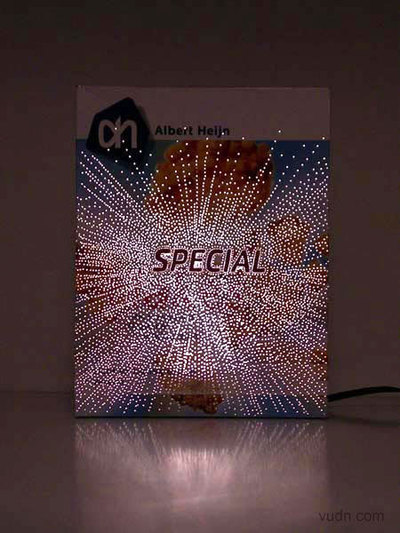 打包光芒:Anke Weiss的包装盒灯 2026年3月20日2009年3月19日 作者 17vis 如何将一个大众产品变成一个独特的产品?设计师 Anke Weiss用针在旧的食品或是饮料包装盒上钻孔,然后在里边装上灯泡让光线从里边透出来,就成了一盏盏漂亮的灯。而且上面的图案也都是根据包装盒上的图案扎出来的,将灯光进行包装设计,你还觉得它只是灯吗?创意无处不在,只要你善于发现……