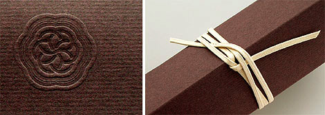 包装细节:左图浮雕标志,右图是丝带包扎图。