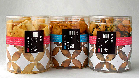 看得到内部的包装罐:三个包装着一口大小的米饼类零食的随手包。