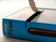 开盒结构常常被认为是包装设计中的功能性细节。但是当考虑到“拆解包装的乐趣”的时候,一个即使是如上面的撕痕也能扮演一个重要的角色。假使你正遭受着“巧克力饥渴症”的折磨,你迫不及待地拆开包装,你那激动人心的撕拆动作可能会立时勾起你沉浸在巧克力滋味时的回忆:那种撕痕式包装所特有的声音和撕拆时的节奏,让你觉得这个动作本身就和里面的巧克力一样甜了。你就好象巴浦洛夫的狗(译者按,经典的条件反射实验),只是这次的对象是巧克力了。