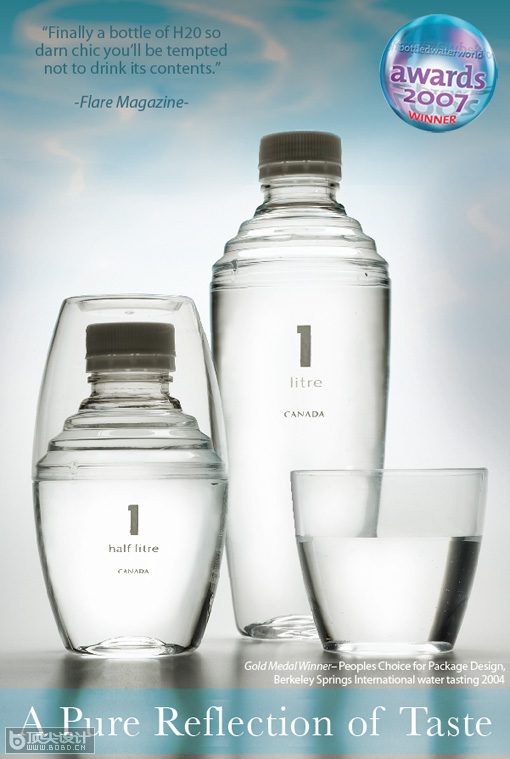 1公升是一款成功的将水的高品质和非凡的设计相结合的矿泉水品牌。水来自与加拿大诺森伯兰森林中的核心位置。包装瓶集成了一个杯子是这款产品的一大特色。
