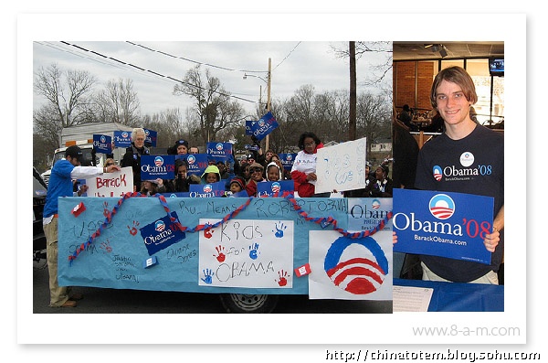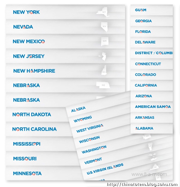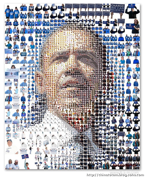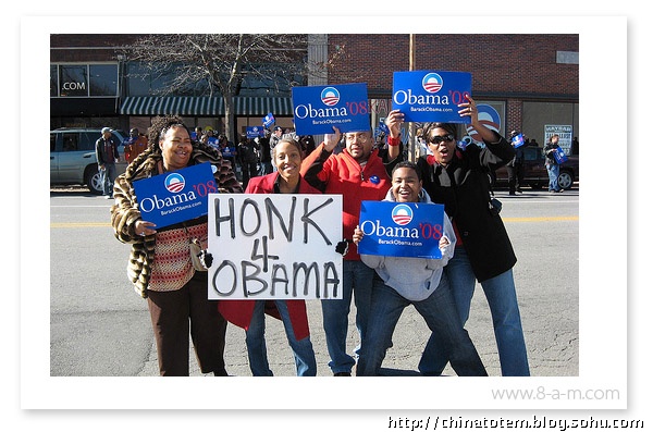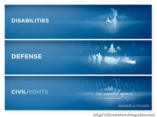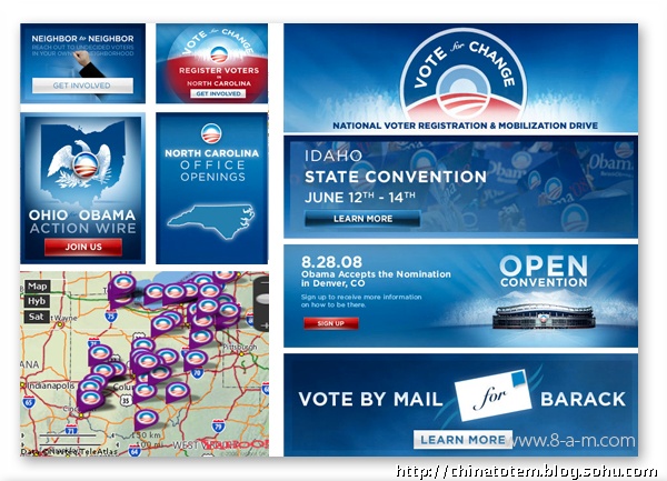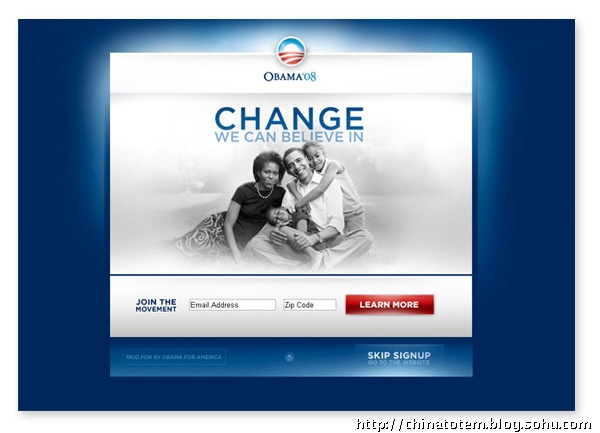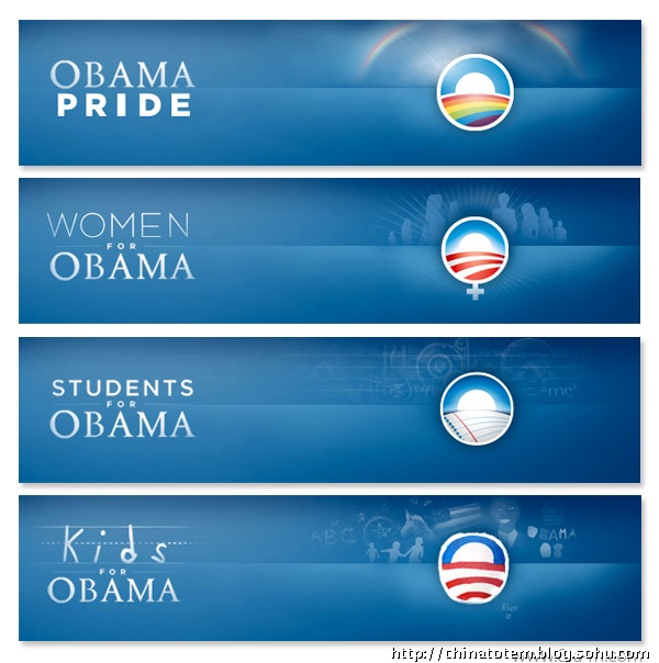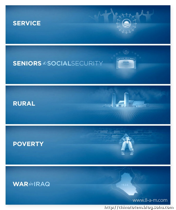 除了为每个州的选民定制化地设计了相的“州标”外,在奥巴马的个人网站barackobama.com 上,针对各种族群以及对各种事务持不同政见的选民,也会演绎出相应的标识图案。比如环保主义者(Environmentalists for Obama)一页中,Logo 变成黄色日光照耀下的绿色田野;在孩子(Kids for Obama)的页面中,Logo 变成用手写笔涂鸦的样子;而在美国黑(African Americans forObama)那一页,Logo 后出现了隐隐约约的一大群人,你没法仔细辨认其中的任何面孔。这些纷繁的变体设计,似乎也从另一方面印证了当代美国生活的复杂。事实上,对奥巴马在设计中的良苦用心以及设计团队的殚精竭虑,选民们用不着去一一“解码”,其效用,不正在于最直接地获得选民们的好感吗?