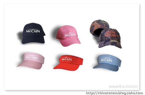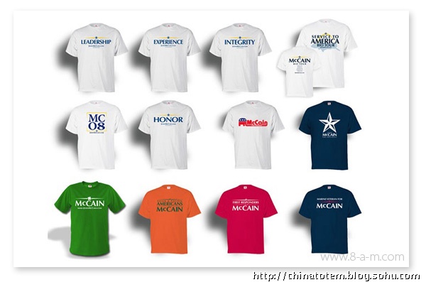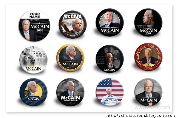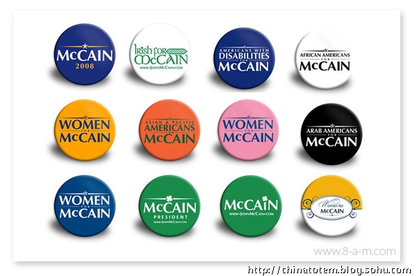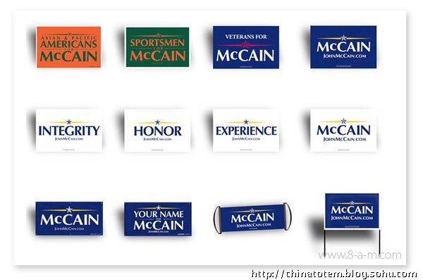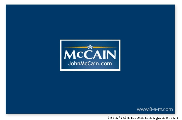 给政治人物做VI 设计风险巨大,对平面设计组织而言是件棘手的活。看看希拉里和麦凯恩老掉牙的VI 套路吧。希拉里保守的“Hillary for president”图形由红、白、蓝三色组成(这招是美国国旗诞生以来延续至今的传统,用过的候选人不下几十个),她选择了用波形曲线收尾的老式衬线字体,象征着传统与庄重。当然,用这来体现她的个人形象也无可厚非。相比较而言,麦凯恩算是有点新意,他用黑、白、黄三色构成带有军队风格的五星,提醒选民自己的越战背景和“男子气概”。