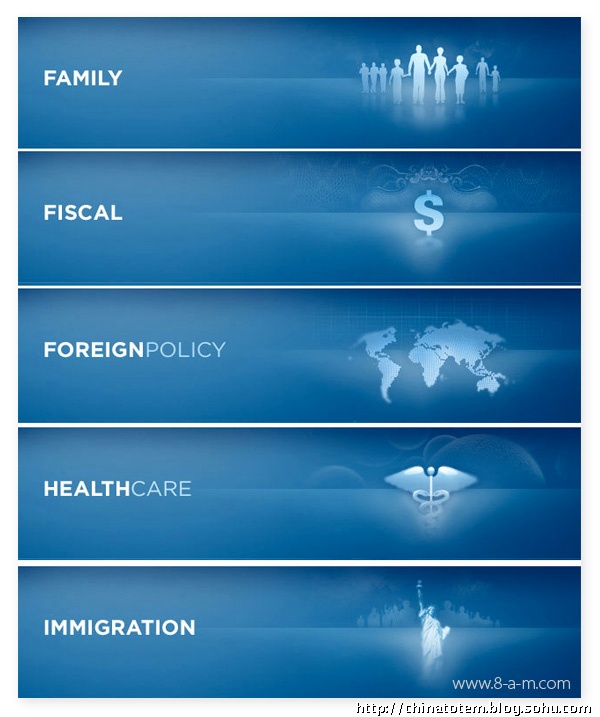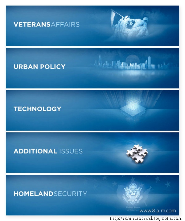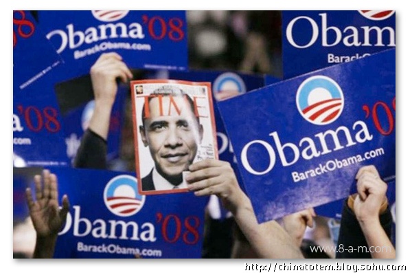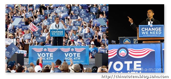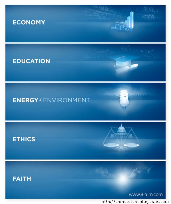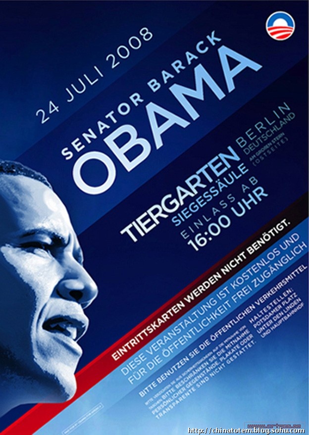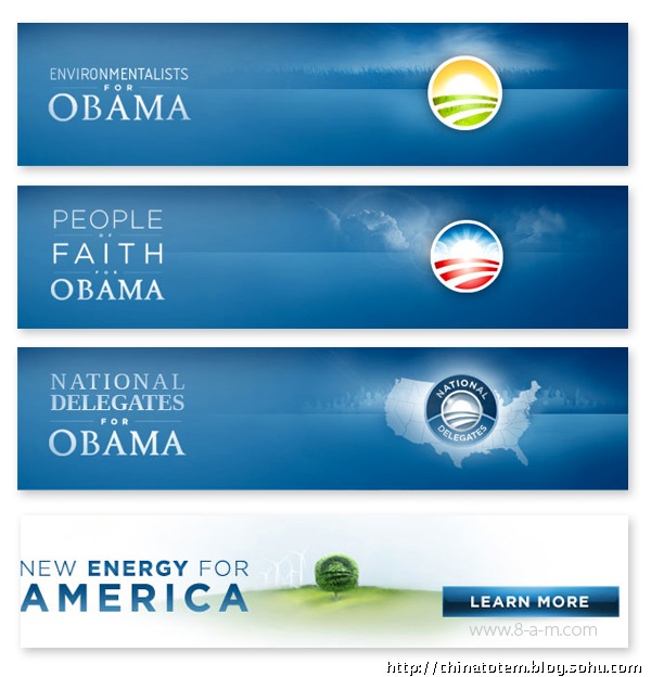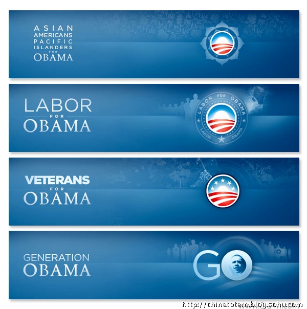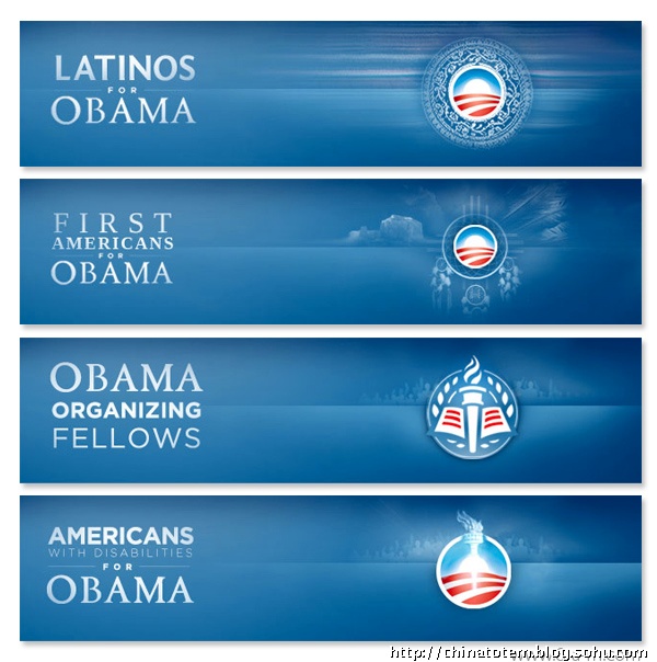 在色彩上,奥巴马选择的仍是美国国旗上的红、白、蓝三色,用最为令人放松的蓝色做底色,显然是为了消除选民对奥巴马相对缺乏经验的怀疑。