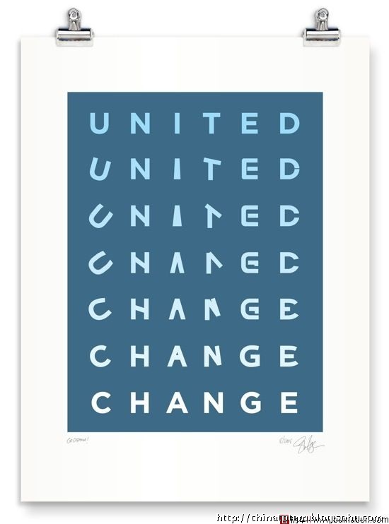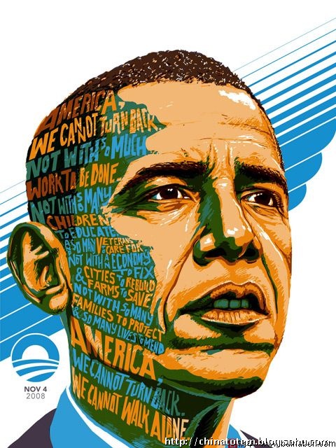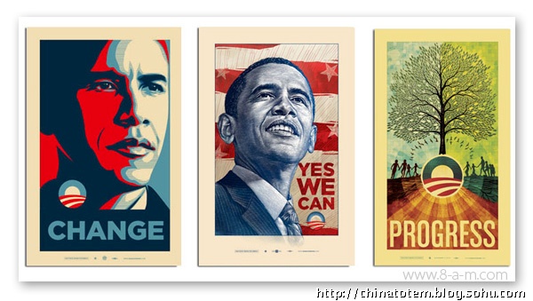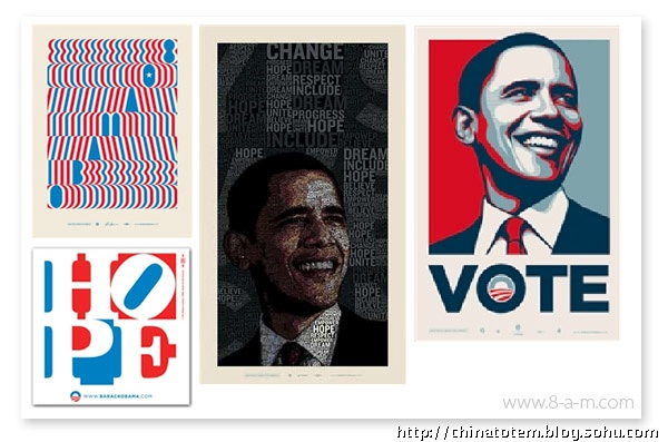 奥巴马却不拘泥于此。深知VI 设计重要性的他,拒绝了政治设计的惯例,别出心裁地邀请了一群新锐设计力量充当VI 设计的主力。在平面设计师乔纳森·胡福勒(Jonathan Hoefler)看来,“没有比奥巴马更会利用‘设计’的人了”。除了仿照切·格瓦拉的形象,将奥巴马的头像制作成波普风格的海报等显而易见的大动作外,这个由大卫·艾克瑟洛德(David Axelrod)领衔的芝加哥设计团体还进行了大量细致入微而又不乏冒险精神的工作。他们的目标是色彩、图形和字体要面面俱到,无论它们出现在横幅、印刷品或者网站上,都能触发选民们对奥巴马的好感。