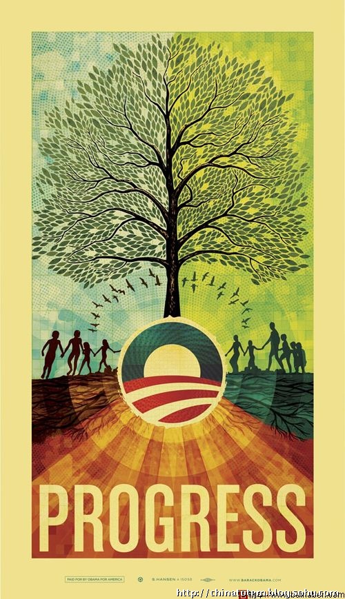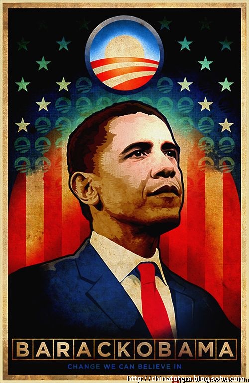图形方面,一个太阳在美国国旗的红色条纹中冉冉升起,“这非常形象,象征着希望、变化以及一个新的政治时代”,艾克瑟洛德解释道。同时,这个近似“O”的图形还是奥巴马名字的首字母。奥巴马的竞选口号是“改变就是我们的信念”(Change We Can Believe In),显然,如果一切都能重新开始,那么初升的红日就是最好的鼓励。