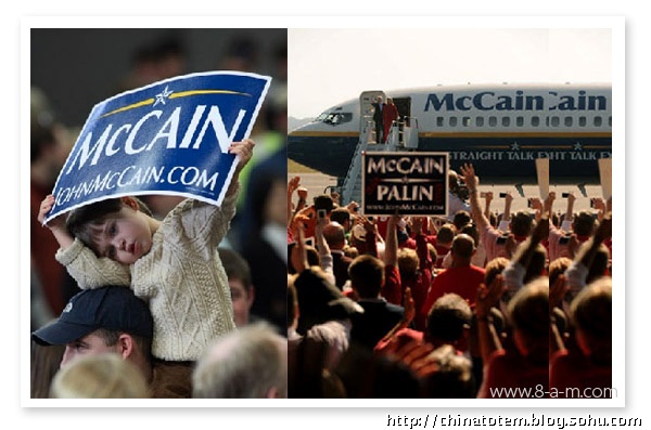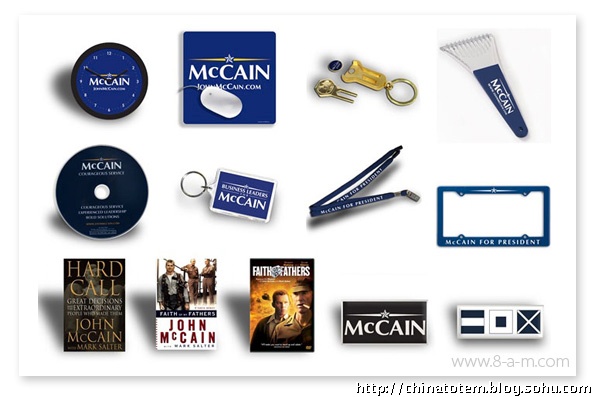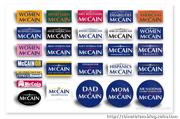 给政治人物做VI 设计风险巨大,对平面设计组织而言是件棘手的活。看看希拉里和麦凯恩老掉牙的VI 套路吧。希拉里保守的“Hillary for president”图形由红、白、蓝三色组成(这招是美国国旗诞生以来延续至今的传统,用过的候选人不下几十个),她选择了用波形曲线收尾的老式衬线字体,象征着传统与庄重。当然,用这来体现她的个人形象也无可厚非。相比较而言,麦凯恩算是有点新意,他用黑、白、黄三色构成带有军队风格的五星,提醒选民自己的越战背景和“男子气概”。