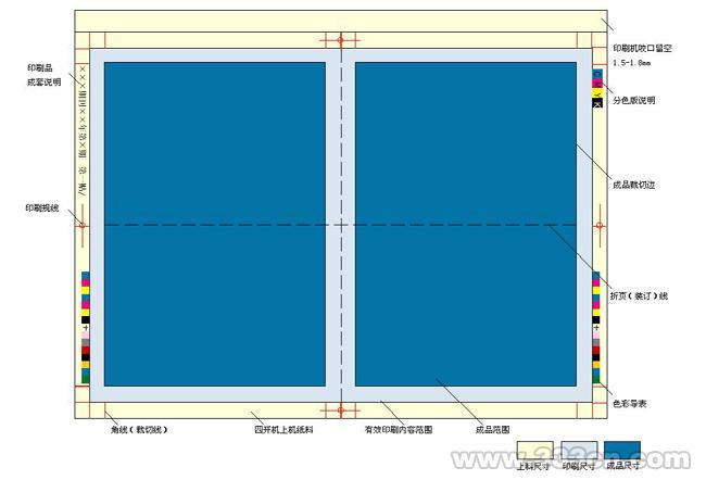 首先在完稿前,要对采用何种规格纸张,然后制定成品开度,计算成品开度时,还要考虑印刷品通过上机时,减出相应的咬口位(横向12 15mm),有满版色底或图片出血时,要预留裁切位(3mm),在剩下的尺寸中还要减出印制工序中的各种预留空间,如装订时裁切位,包装品还要考虑包装糊口(粘贴口)等位置。因此,印刷成品不是简单的以纸全开张大小除以开度。只有充分了解印刷工艺,才可以准确无误的利用合理的成品尺寸,乃至节省成本费用。