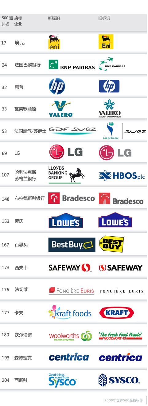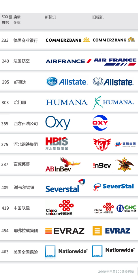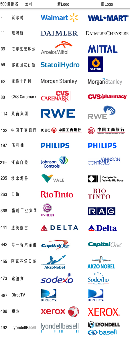 美国权威财经杂志《财富》在7月初公布2009年度世界500强企业排行榜,根据这份最新的榜单,制作了一份2009年度世界500强企业在过去一年(大概时间范围是2008年7月至2009年7月)更换企业标识的情况的榜单。通过这份榜单,你也许能够看到企业视觉形象革新的核心部分—企业标识设计的一些趋势。