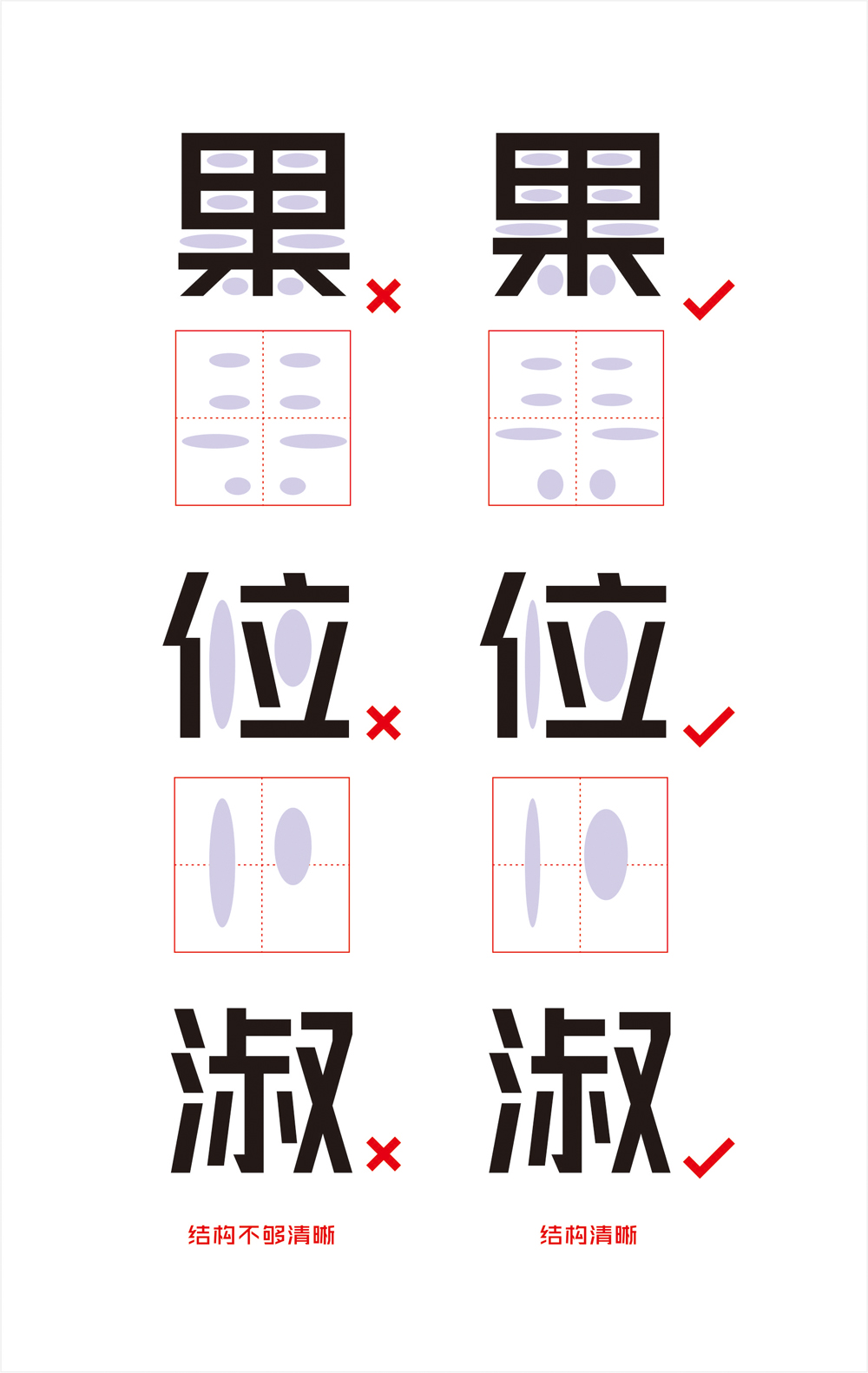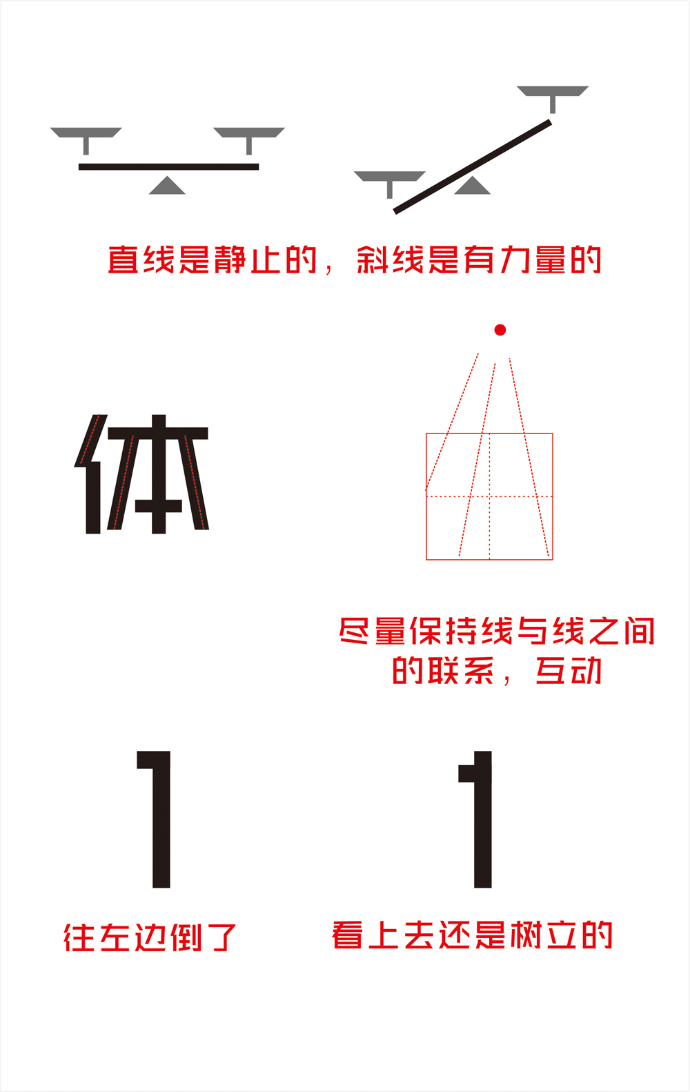 常常一些字看上去东倒西歪的,是斜线起了作用,那怎么去处理这种情况呢?这事情真的很考功夫,很多时候都只能靠经验,甚至直觉(这里的说的直觉是理性的)。建议大家多思考,多分析,我下面简单举几个例子,毕竟出现的情况种类太多了。以后我想到的时候跟大家再说,现在都5点了。。。这也是字体设计的一个非常大的重点,我以后会着重说