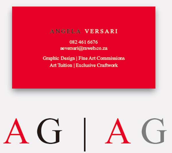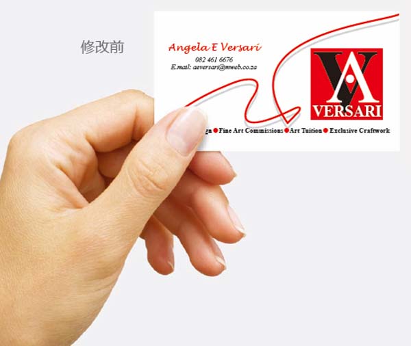 读者Angela Versari最近给了一张她的名片给我们看,希望我们能够对她的名片做些建议。她说:“我喜欢Times New Roman字体,也喜欢红黑这两种颜色。我希望标志能够强有力及富冲击力,我不希望将标志设计得过于花俏及过于柔和,也不希望标志显得过于富浪漫气息。”