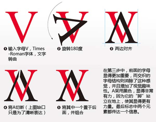 留意名称使用了Times New Roman字体,与标志完美配合,其字体尺寸较小,增强了标志的力量感及对比。再来对比一下原来的标志,白色的VERSARI与上面的字母A形成注意力的冲突。请注意,我们设计时,只需要一个焦点,才显得更有力量。这个标志中,AV这两个字母就是一个舍我其谁的主角,所有的注意力都应该从这两个字母着手。