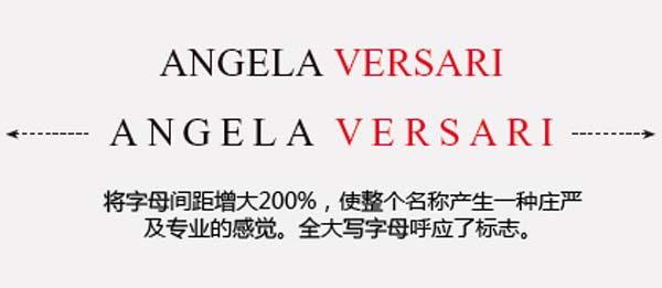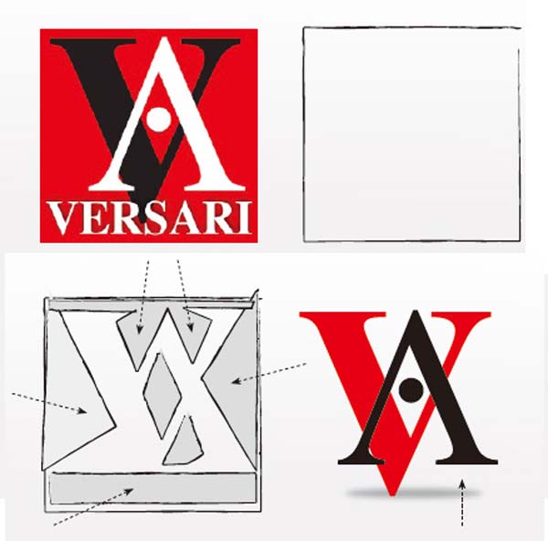 AV特有的交叉状轮廓结构使其非常容易“阅读”,但加了那个红色的区域,却使整体只是一个正方形,更糟的是,盒子里面的所有元素都显得拥挤。留意标志中的V使用了Times粗体,这使到它比Times Roman字体缺少了一些优雅。但在尺寸较大时观察,还形成了一种视觉矛盾——虽然Times字体传达出一种重量感及坚实感,但在原来的标志中它却是漂浮的。特别是VERSARI加了阴影后,这种漂浮的感觉更强烈,意味着标志是离地,但从其阴影判断,其光源又似乎是在由下往上照,给人一种不自然的感觉。