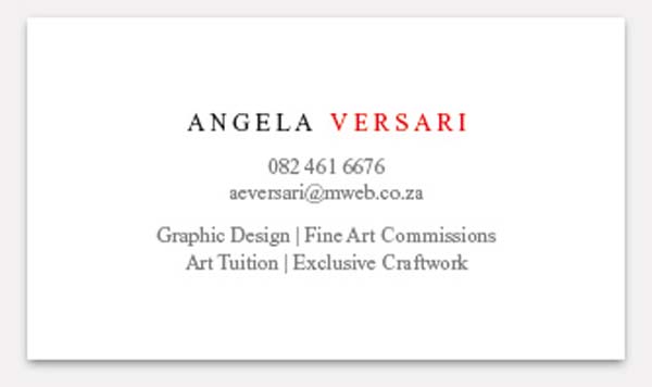 不想这么高调,那就还是把名称加上吧。名称全部为大写字母,Times New Roman字体的名称形成了一条贯穿名片的直线,同样居中。将ANGELA这几个字母设为黑色,而VERSARI设为白色,在这里,各个元素的视觉(包括字母,字体,颜色及排版)都互相得到增强。出来的效果就是“强有力及富冲击力”——我们实现了Angela的两个目标,这种排版当然也说不上是一种“花俏”或“柔和”的设计,但你倒是可以在其中感受到一些“浪漫”的气息!