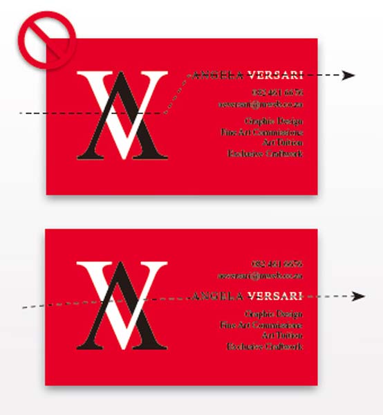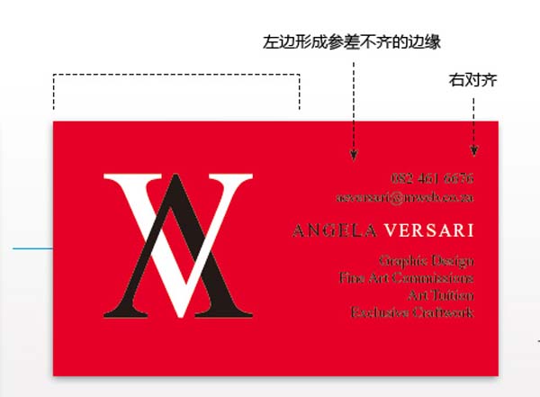 留意Angela名字的放置,我们是放在文字的中间的,而不是放上最上方。因为在这个设计中,中心线的位置力量感最强,名字放在中间位置,整体加强了名片的这条中心线的力量。