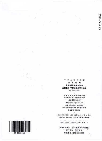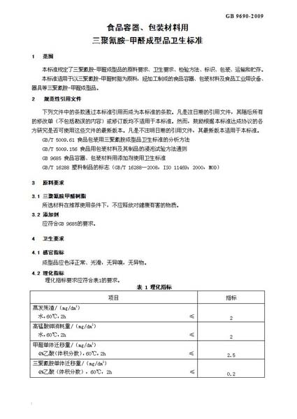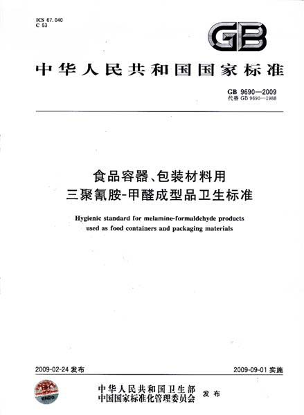 GB 9690-2009 《食品容器、包装材料用三聚氰胺-甲醛成型品卫 2026年3月21日2011年4月22日 作者 17vis GB 9690-2009 《食品容器、包装材料用三聚氰胺-甲醛成型品卫生标准》已于2009年2月24日通过,已经正式出版发行,国际食品包装协会已于09年5月6日获得该标准原件,标准自2009年9月1日起施行,现予公布。 点击下载 GB 9690-2009 《食品容器、包装材料用三聚氰胺-甲醛成型品卫生标准》电子版