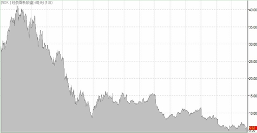 笔者长期持有苹果股票,并曾一度持有谷歌股票,所以对同版块的诺基亚股票也一直关注。从诺基亚的股价走势图上,我们可以看到,诺基亚的股价近十年来的高点出现在2007年,当时诺基亚的股价一度高达42.22美金,而后一路向下,直到上周末的5.67美金。有心的读者可能会注意到2007年正是苹果IPHONE横空出世的时间,而直到现在,诺基亚不但没有推出比IPHONE更具创新性的产品,甚至也没有推出一款接近IPHONE用户体验的产品,持续的束手无策无疑将自己推向了绝路。千言万语,在这样一幅不会说话的股价走势图表中也表现的淋漓尽至。刘杰克老师认为,老店品牌面对技术变革的不敏感导致企业破产的例子不胜枚举,诺基亚其实只是若干案例中一例而已。