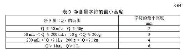 4.1.5.4净含量字符的最小高度应符合表3的规定。