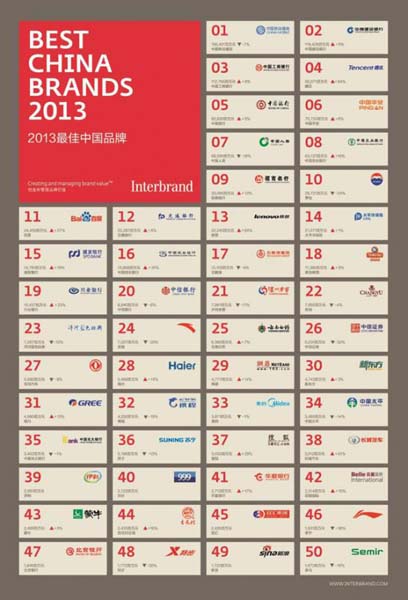 日前,全球品牌咨询机构Interbrand发布了2013最佳中国品牌价值排行榜,中国移动稳居榜单第一的位置;中国建设银行、中国工商银行名列第二与第三,和去年保持一致;腾讯强势登上第四的位置,排名较去年上升了四位;中国银行依旧保持第五名的位置。三九、双汇以及北京银行自2011年之后重返榜单,新浪和伊利则是首次进入Interbrand2013最佳中国品牌价值排行榜。