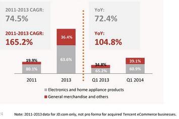 2013年,京东年度成交总额GMV为1255亿元人民币,同比增速71%;其中自营占比75%。净营收为693亿元,同比增68%。毛利率9.9%