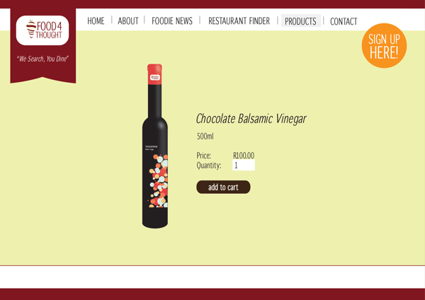 一种香醋和橄榄油酱是认为什么食物应该在餐馆和活动,品尝德班出售。我建议这些敷料可供顾客使用他们在餐馆的桌子。这允许他们尝到所需的口味和购买产品的资金去深思。饭店的厨师也可以自由地与他们做饭。我推荐的产品属于深思本身作为产品可以分布在几个餐厅以及网上销售。