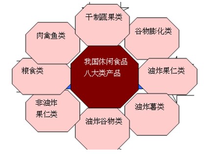 目前,我国休闲食品大致可分为八大类,即谷物膨化类、油炸果仁类、油炸薯类、油炸谷物类、非油炸果仁类、糖食类、肉禽鱼类、干制蔬果类(如下图)。其中,糖果、蜜饯、膨化、谷物类是休闲食品行业起步最早,也是发展最为成熟的品类,已经形成了强势的领导品牌梯队。