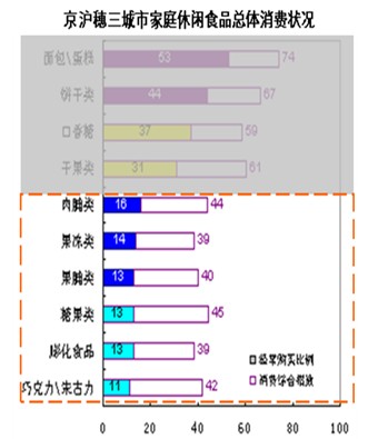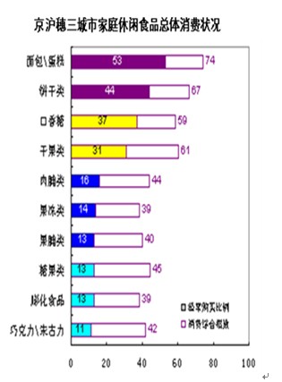 调查数据显示,在各种休闲食品中,面包和蛋糕是京沪穗三城市家庭消费综合指数最高的休闲食品,一半以上的家庭会经常购买面包或蛋糕;其次是饼干类食品。
