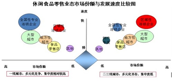 可以看出,一线发达城市休闲食品的零售业态主要表现为:多元化竞争,集中度相对较高。全国性、规模化的连锁企业和大型超市占据了休闲食品销售的较大份额,且发展速度较快。进口食品与国产食品间的零售竞争程度差别不大,竞争都异常激烈。